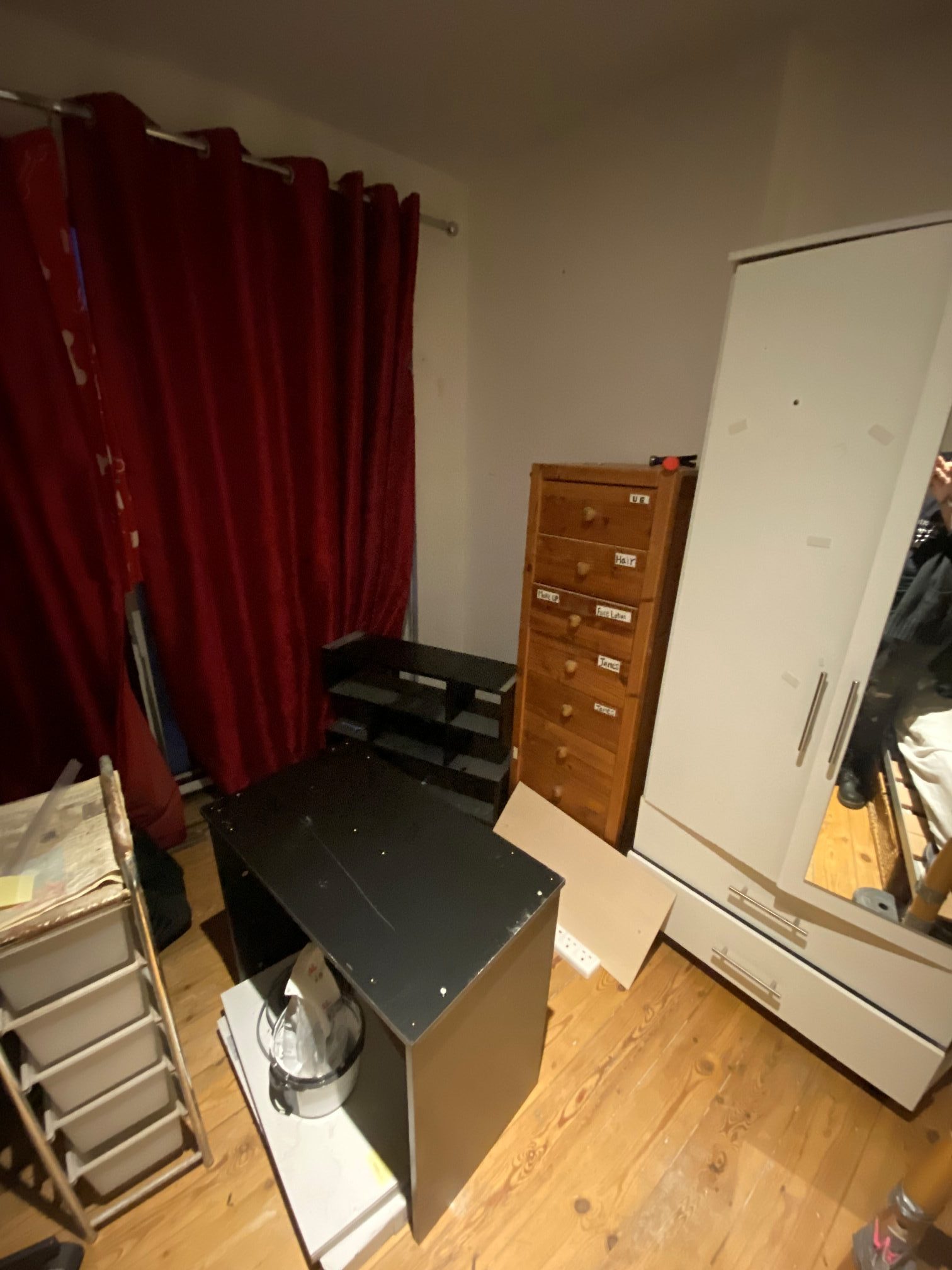 Much of these pieces of furniture had been repaired multiple times, and some were held together by tape. I carefully dismantled the ones that needed to go, which included two black storage cases, the wardrobe, and the large desk.