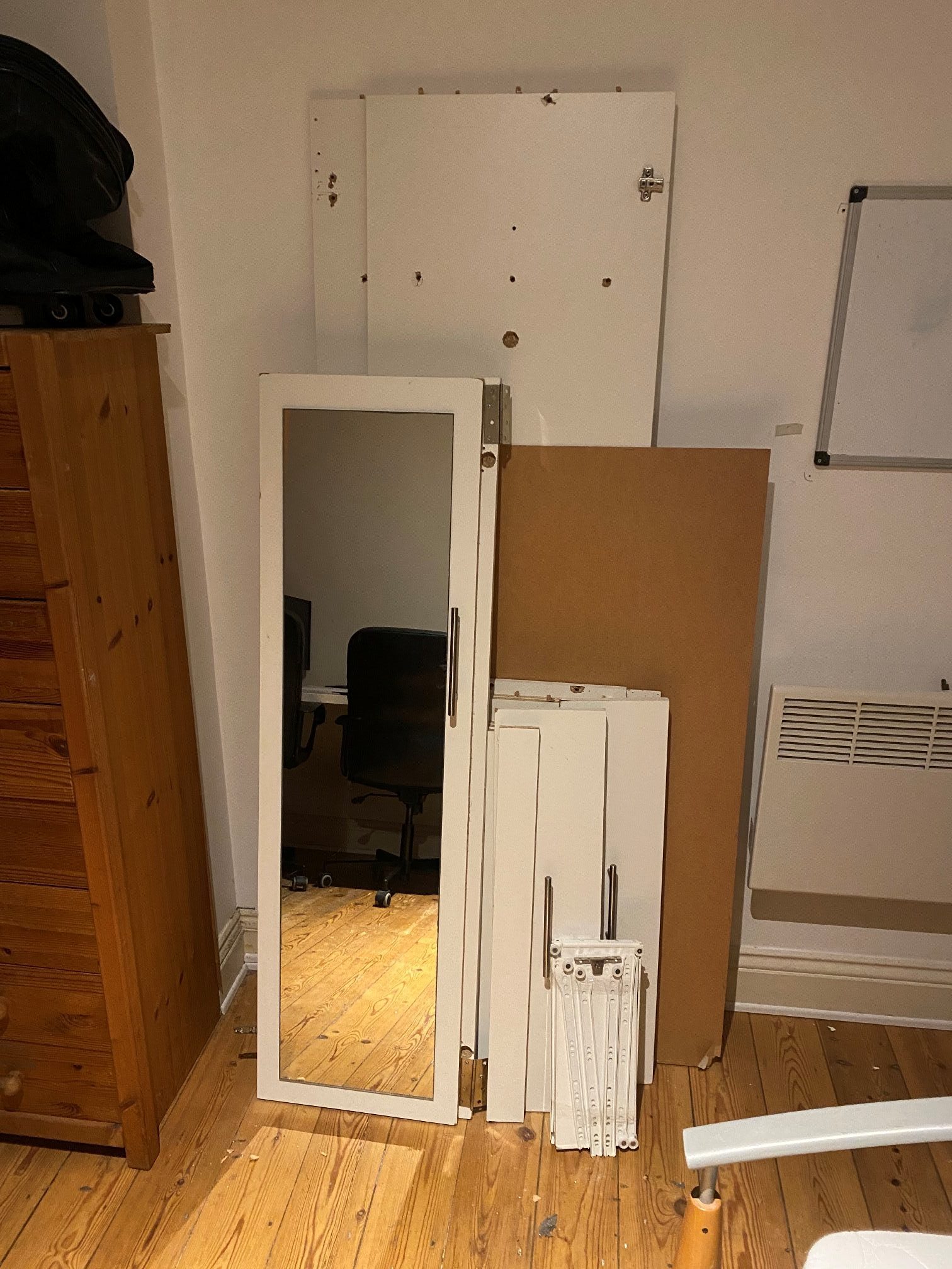 As a bonus, I managed to salvage a platform from the bottom of the white wardrobe, which had wheels, to help me moving around more easily the larger boxes.