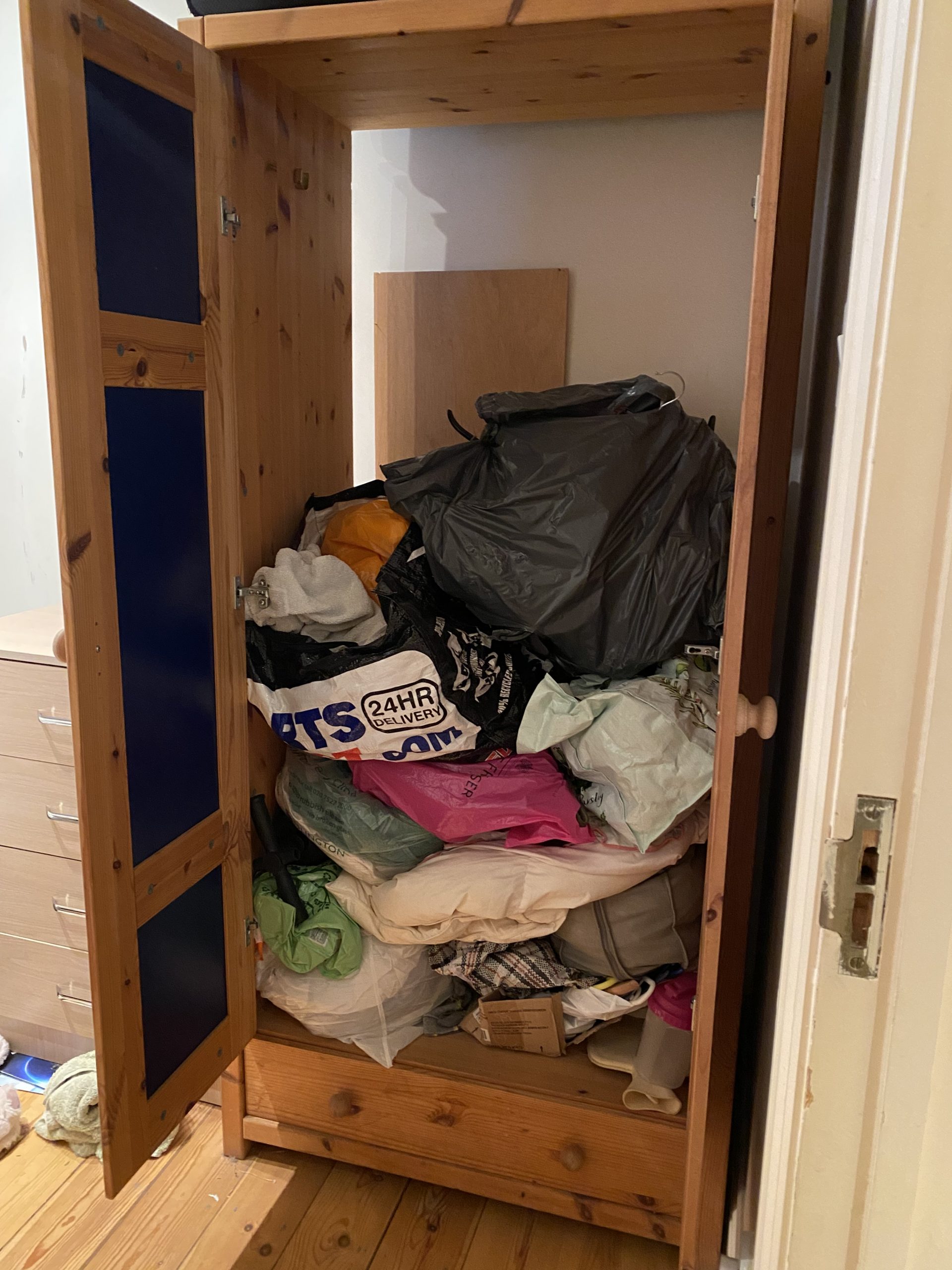 We started with going through the contents of both wardrobe and chest of drawers, and opened up all the bags to divide content by type.