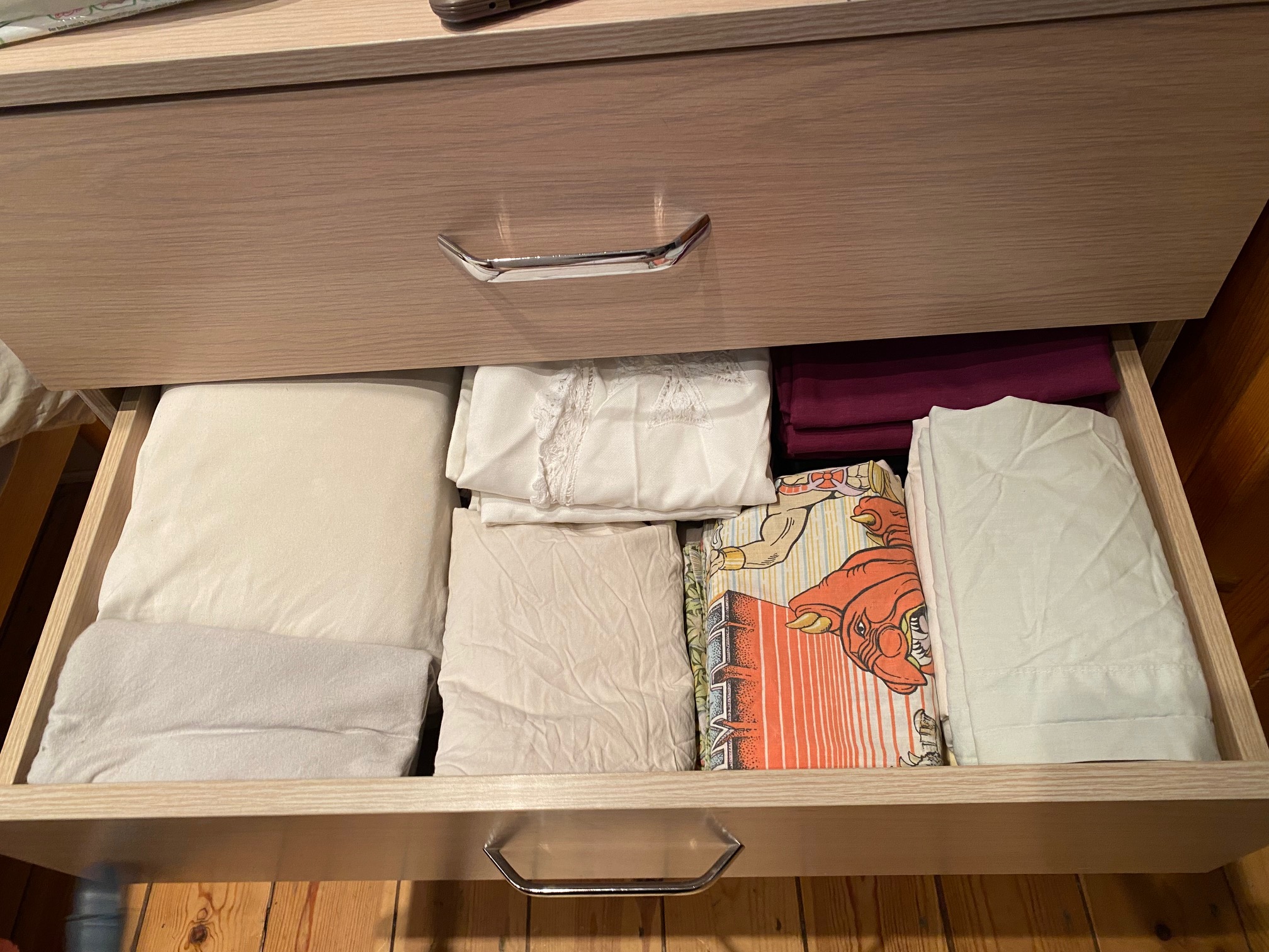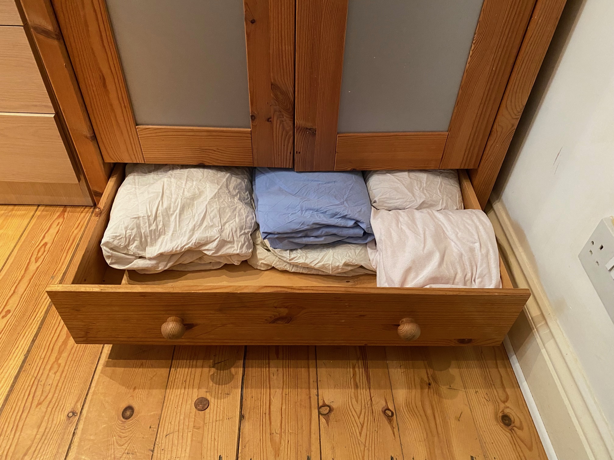 We managed to leave some spare space for extra bed linen in the wardrobe drawer, just in case we need it in the future.