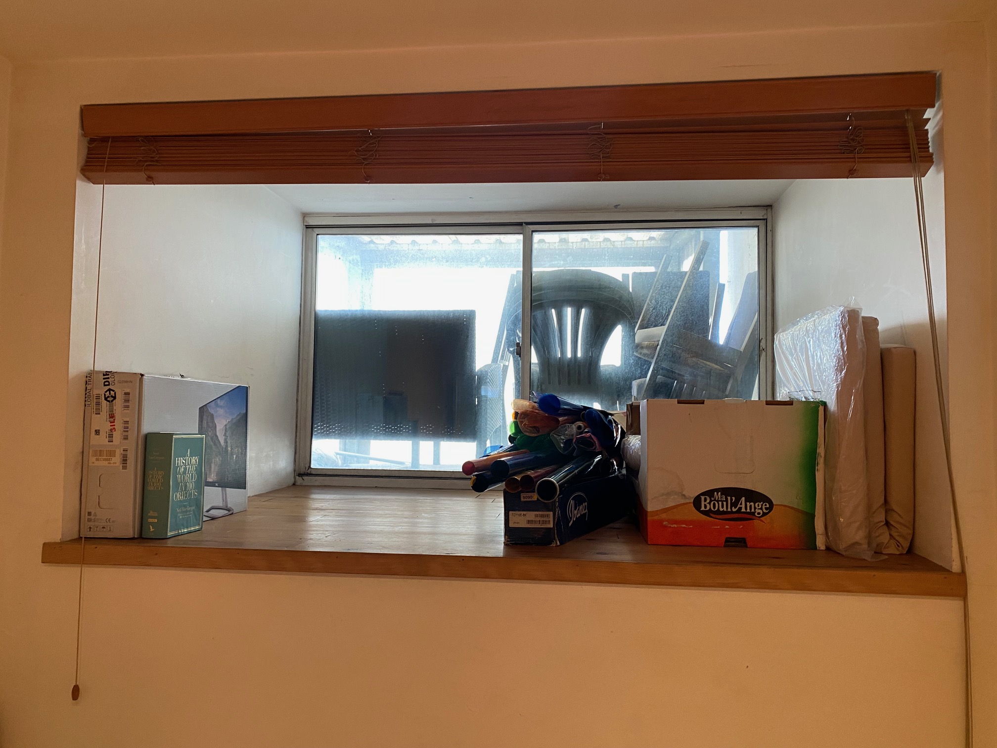 A lot of the boxes by the window were recyclable, and the rest needed to be rearranged or moved somewhere more accessible (like under the bed).