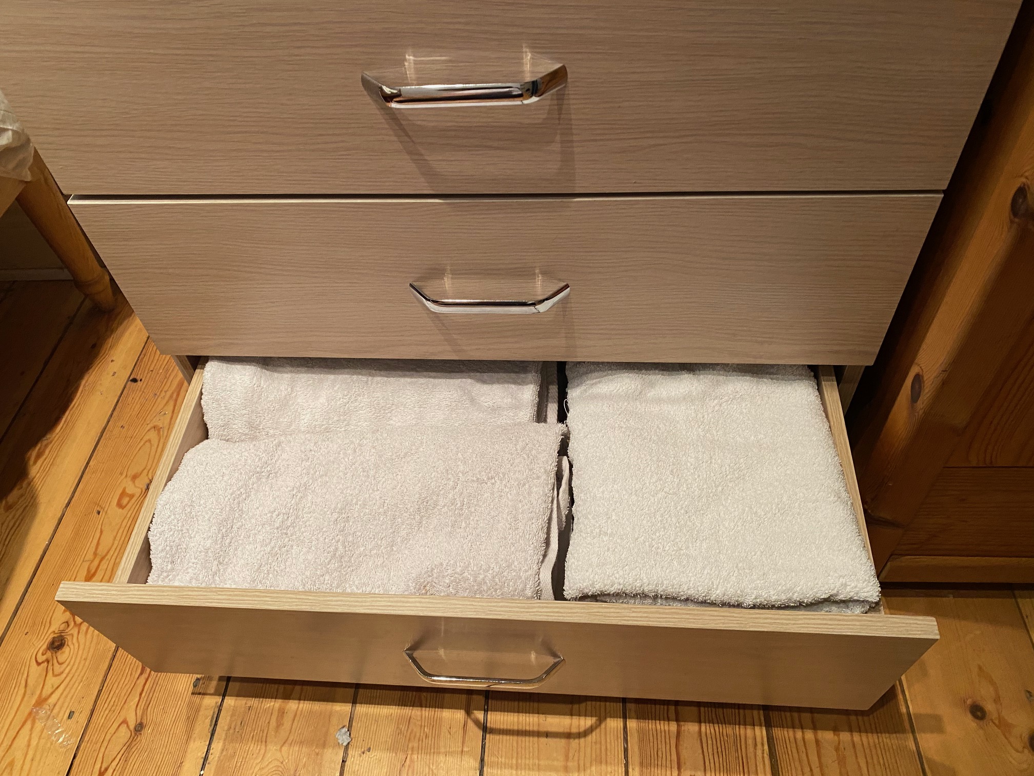 We folded all clothes in a way that worked with the space we had available, using the chest of drawers for the bed linen and towels.