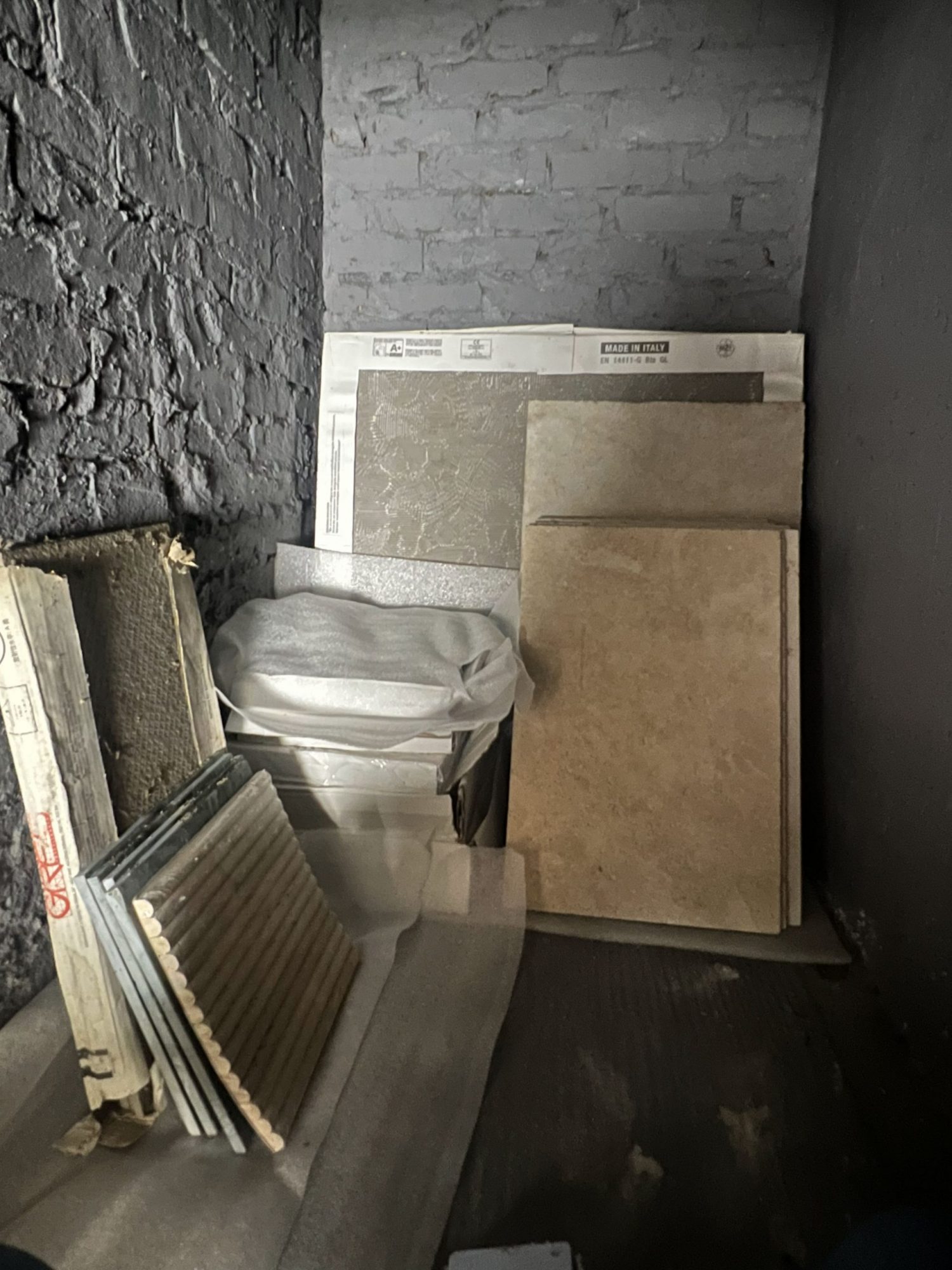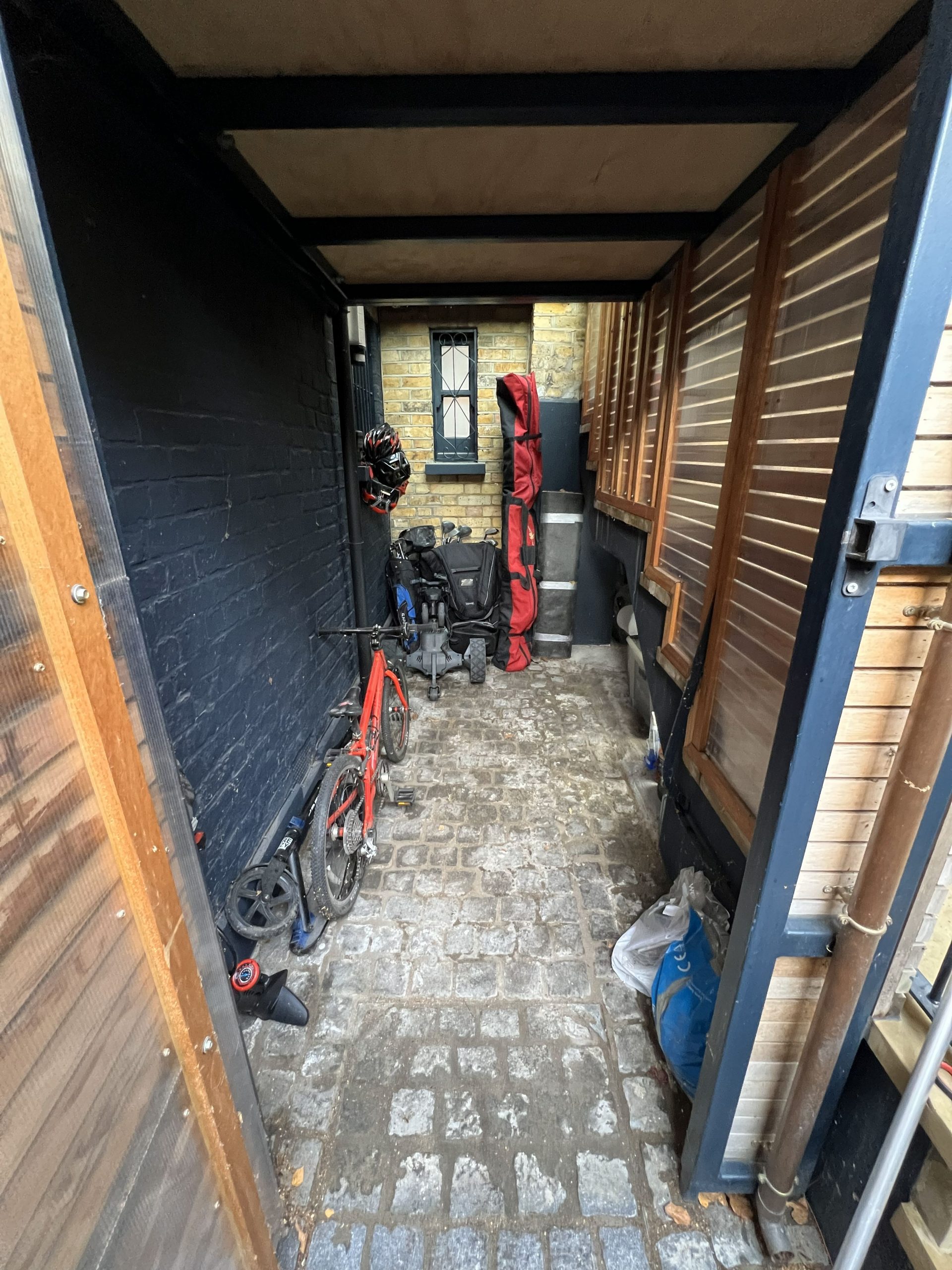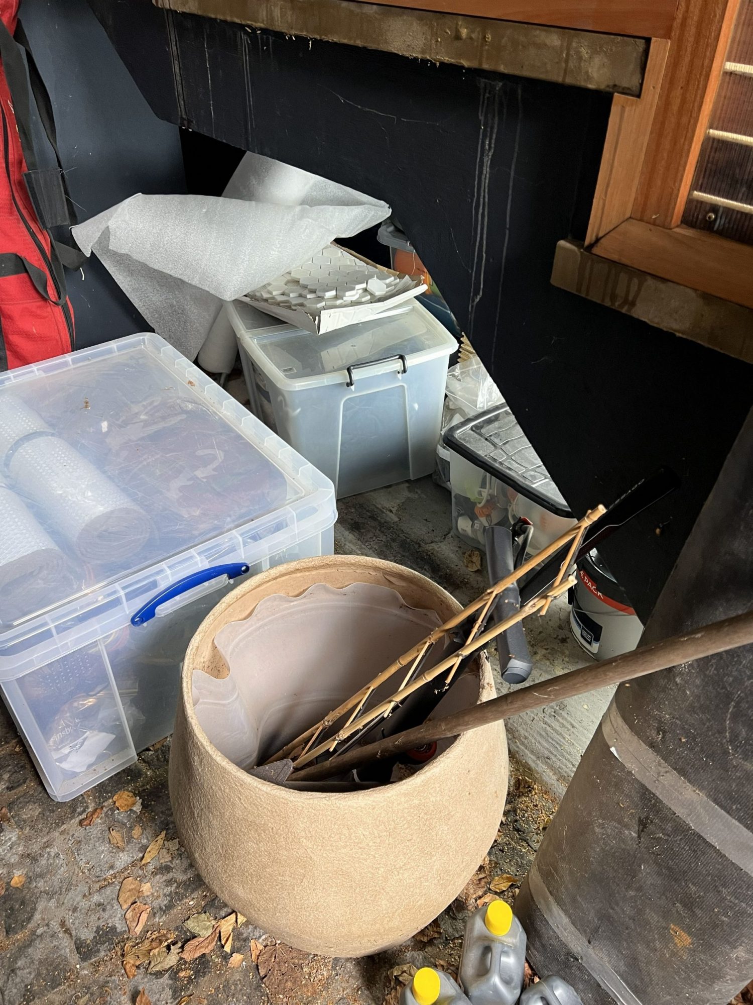 The spare tiles and wood flooring went at the very back of the shed, under the stairs. Access wasn’t easy, but the area was dry and perfect for storing things not needed in the short term.
